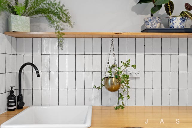 Two bedrooms offer inviting retreats, with the large master enjoying a walk-in robe and the second bedroom equipped with a built-in robe for easy storage. Serving the bedrooms is the beautifully tiled bathroom, where a walk-in shower and a chic timber vanity are highlighted by brushed brass tapware for timeless elegance.